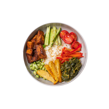 Basmati Rice, Sautéed Spinach, Baked Potatoes, Pea, Bell Pepper, Tomato, Cucumber, Sesame, Grilled Tofu