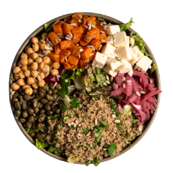 Arugula–Mediterranean Mix, Roasted Pumpkin, Quinoa, Sunflower Seeds, Feta Cheese, Pickled Onion, Capers, Chickpeas