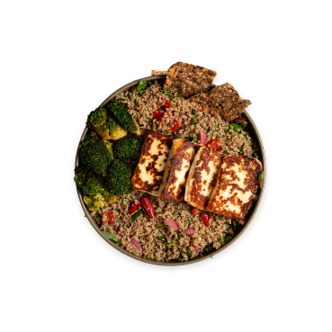 Kinoa, Red Onion, Bell Pepper, Dill, Parsley, Grilled Halloumi, Seed Crackers, Broccoli