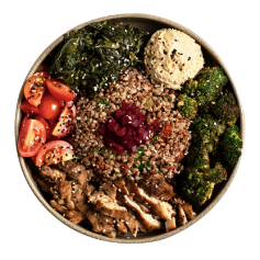 Grilled Chicken, Buckwheat, Beetroot, Sauteed Vegetables, Cherry Tomato, Sesame, Black Cumin, Hummus
