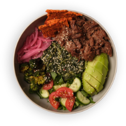 Shredded Beef, Creamy Spinach, Crispy Broccoli, Arugula, Tomato, Cucumber, Avocado, Pickled Onion, Keto Curd Cheese Cracker