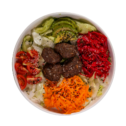 Greens, Meatballs, Avocado, Red Cabbage, Carrot, Tomato, Cucumber, Mexican Beans, Pickled Onion with Honey Mustard
