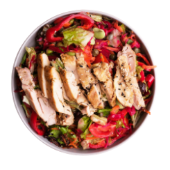 Greens, Lettuce, Grilled Chicken, Capers, Pea, Red Cabbage, Carrot, Tomato, Red Sweet Pepper, Sesame & Nigella Seeds