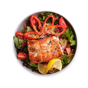 Grilled Salmon, Greens, Capers, Carrot, Pickled Onion, Red Cabbage, Pea, Dill, Tomato, Cucumber, Red Sweet Pepper with Teriyaki Sauce, Sesame, Nigella Seed.
